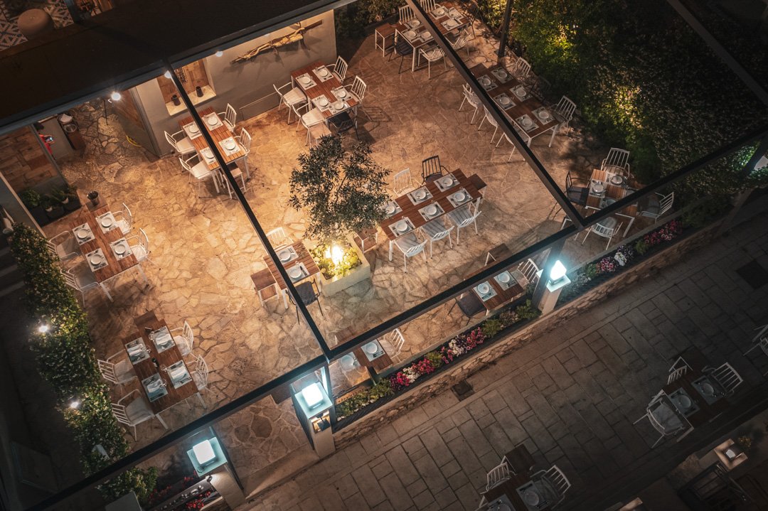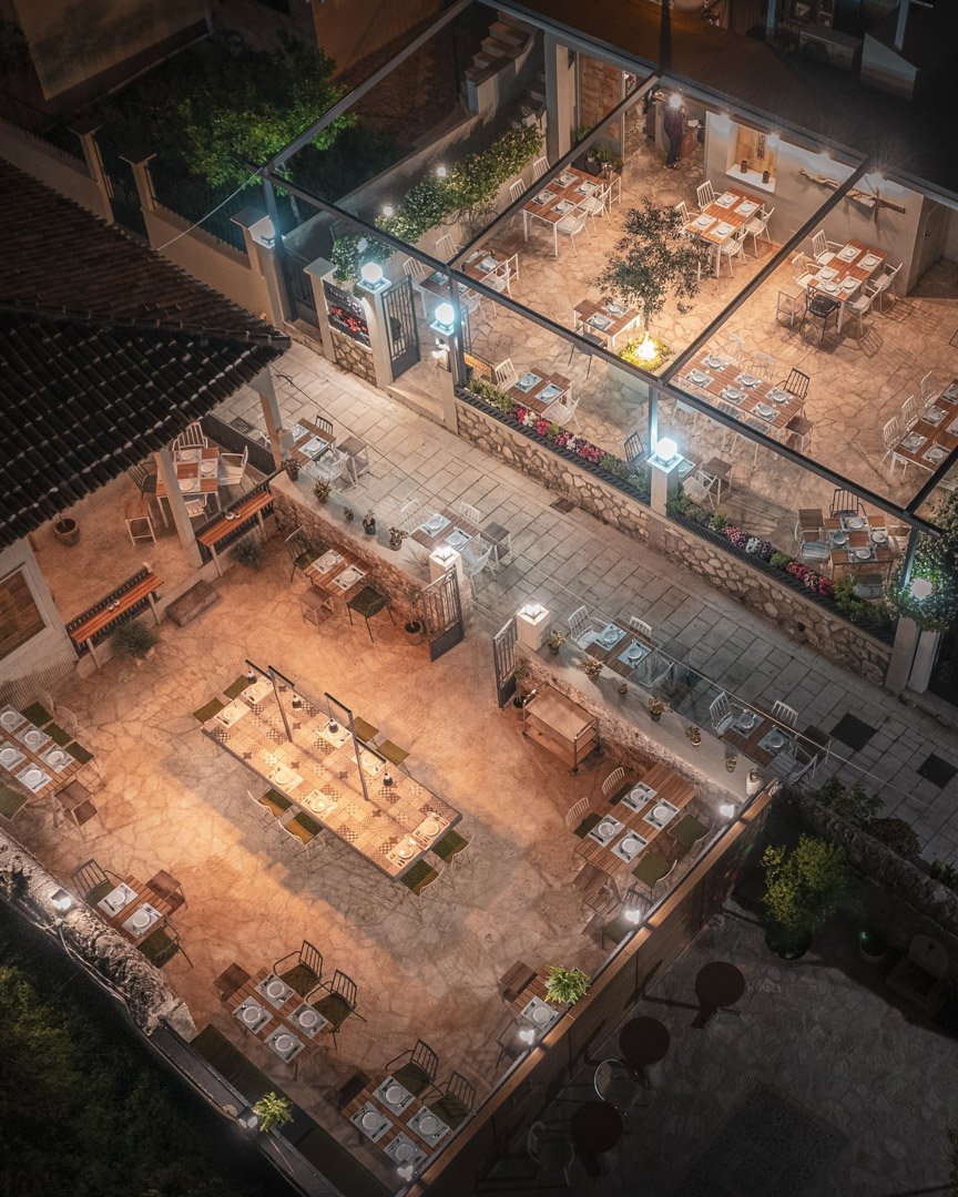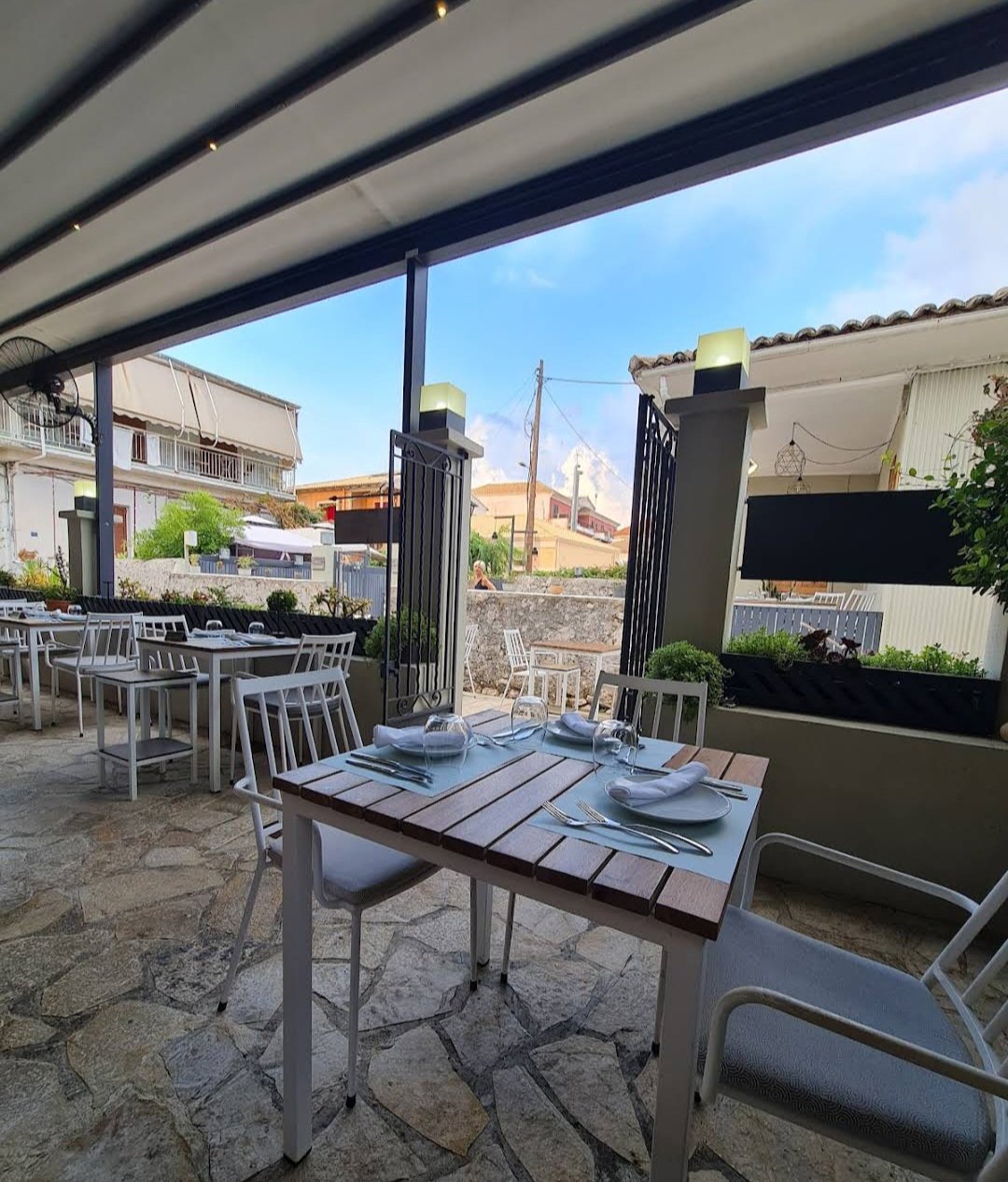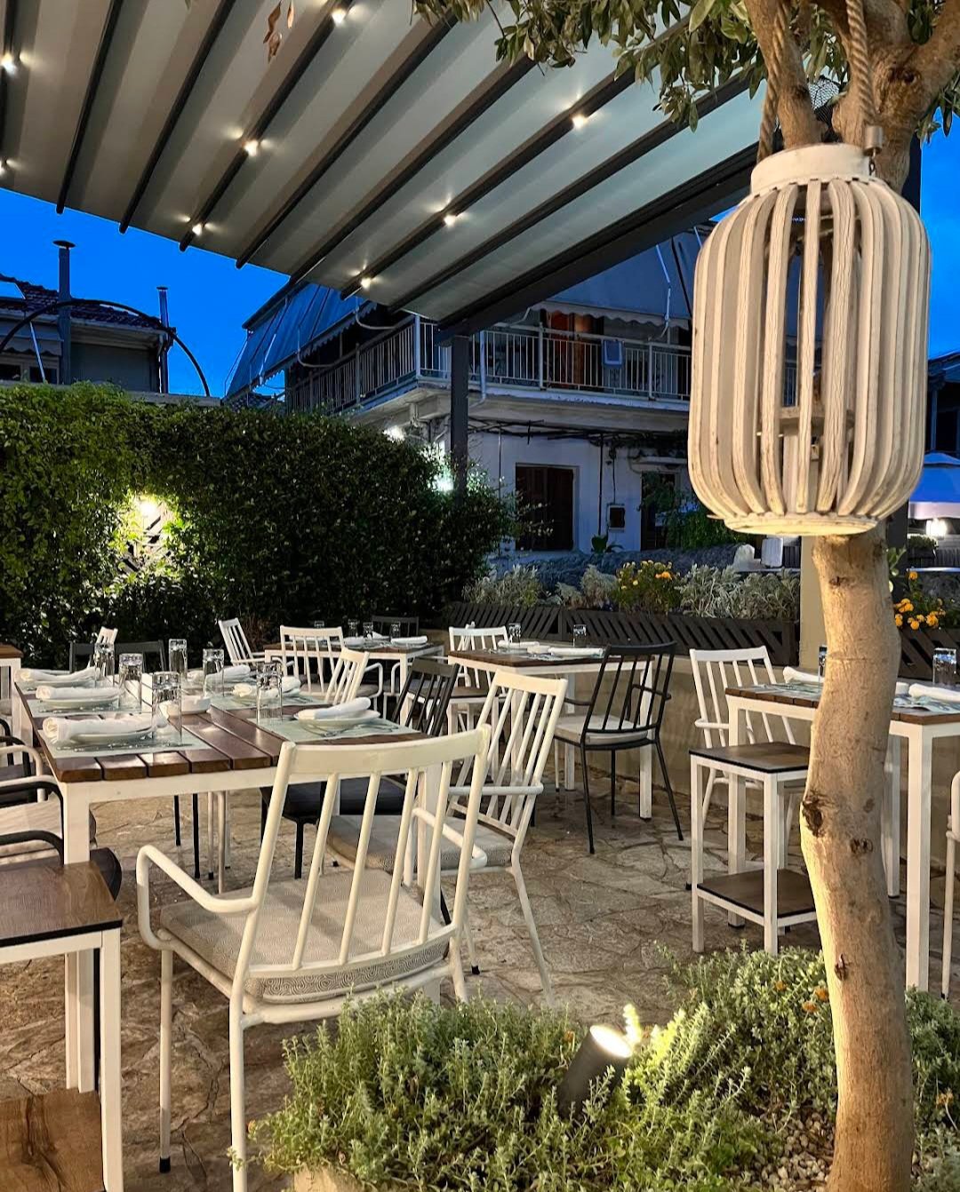 Η πέργκολα προσφέρει αποτελεσματική προστασία από τον ήλιο και τις καιρικές συνθήκες, χωρίς να αλλοιώνει τον χαρακτήρα του χώρου, αναδεικνύοντας παράλληλα τη θέα και τη μοναδική ατμόσφαιρα της Λευκάδας. Το αποτέλεσμα είναι ένας εξωτερικός χώρος υψηλής αισθητικής, απόλυτα εναρμονισμένος με τη φιλοσοφία του εστιατορίου.