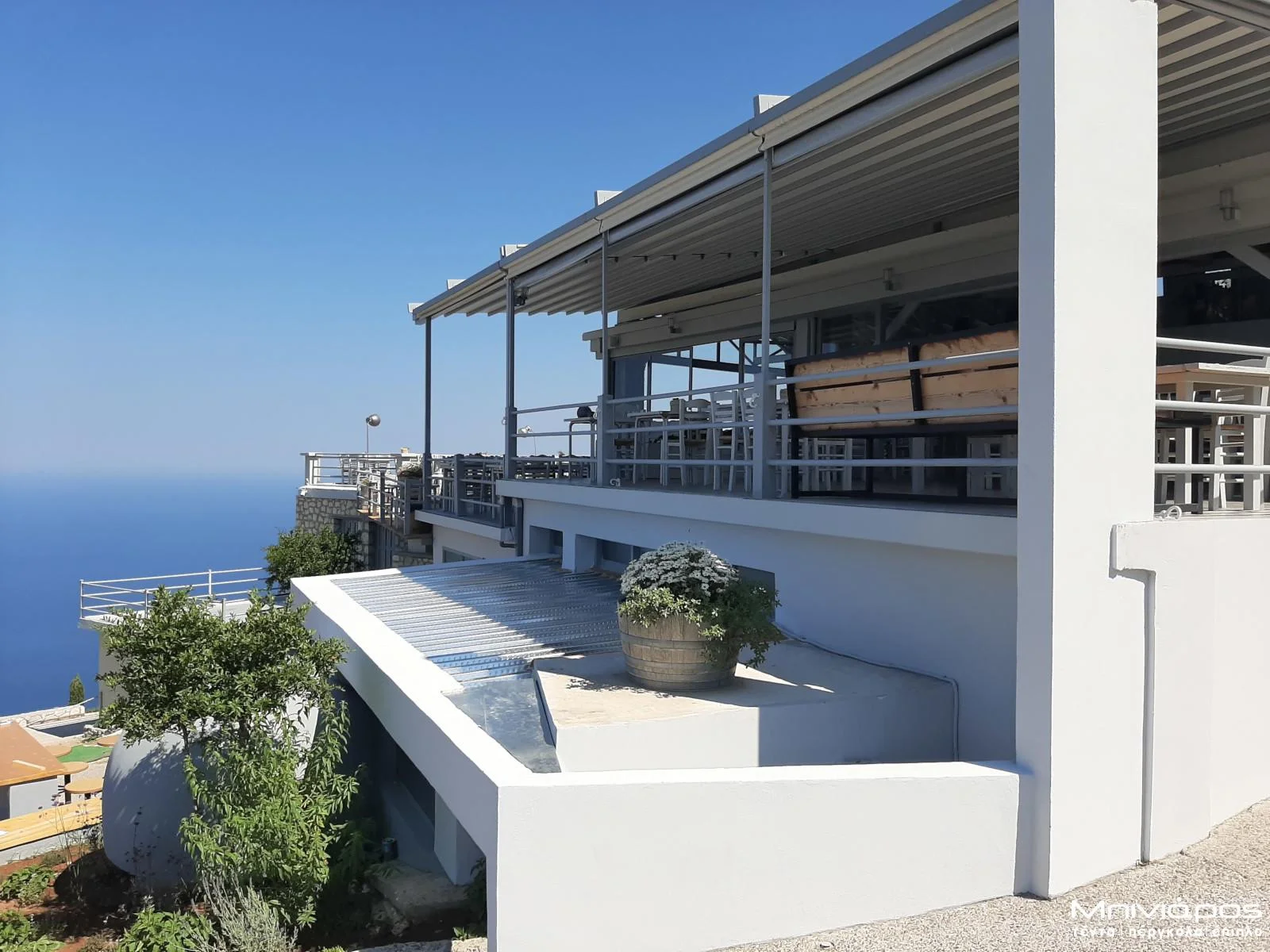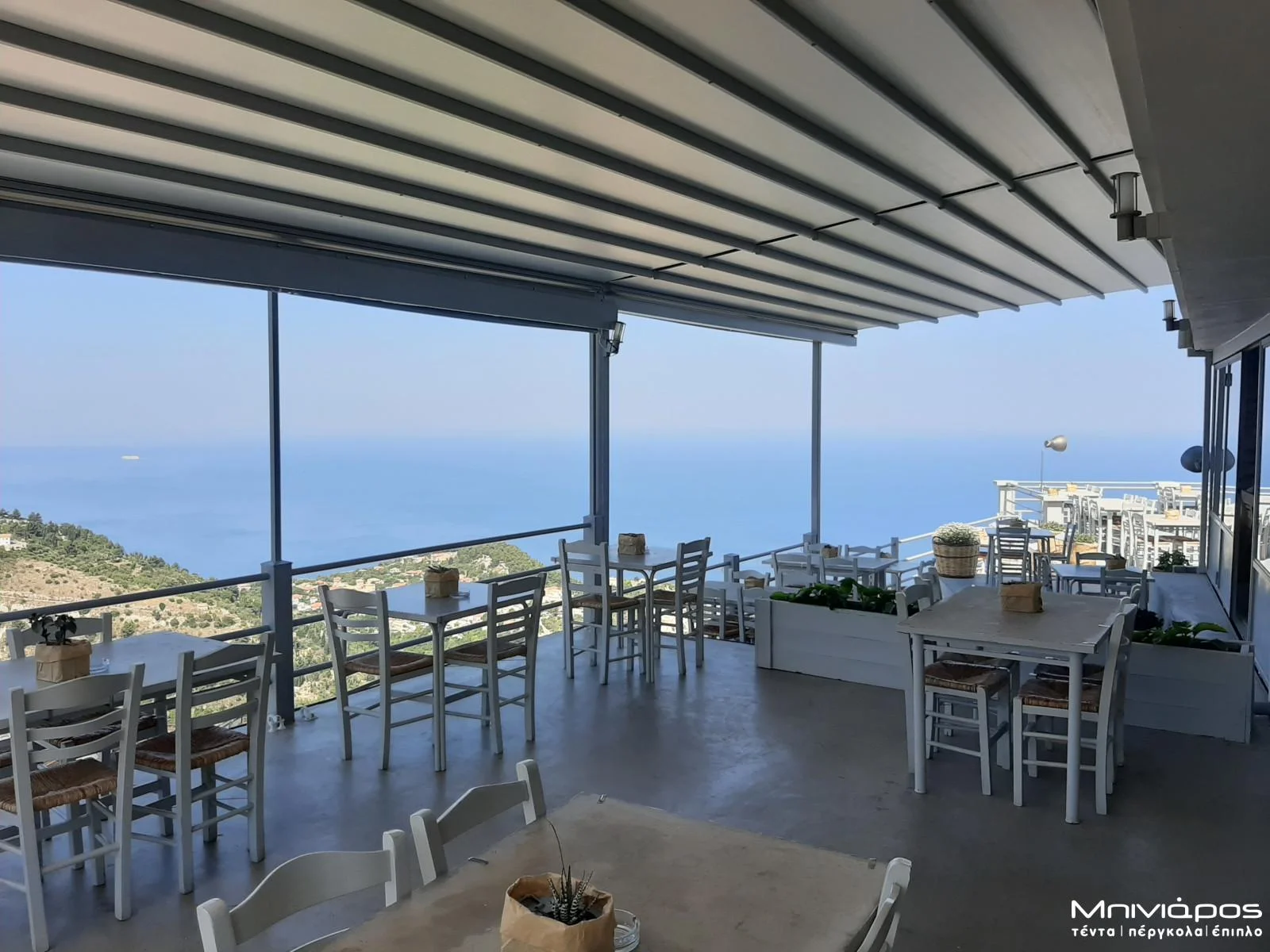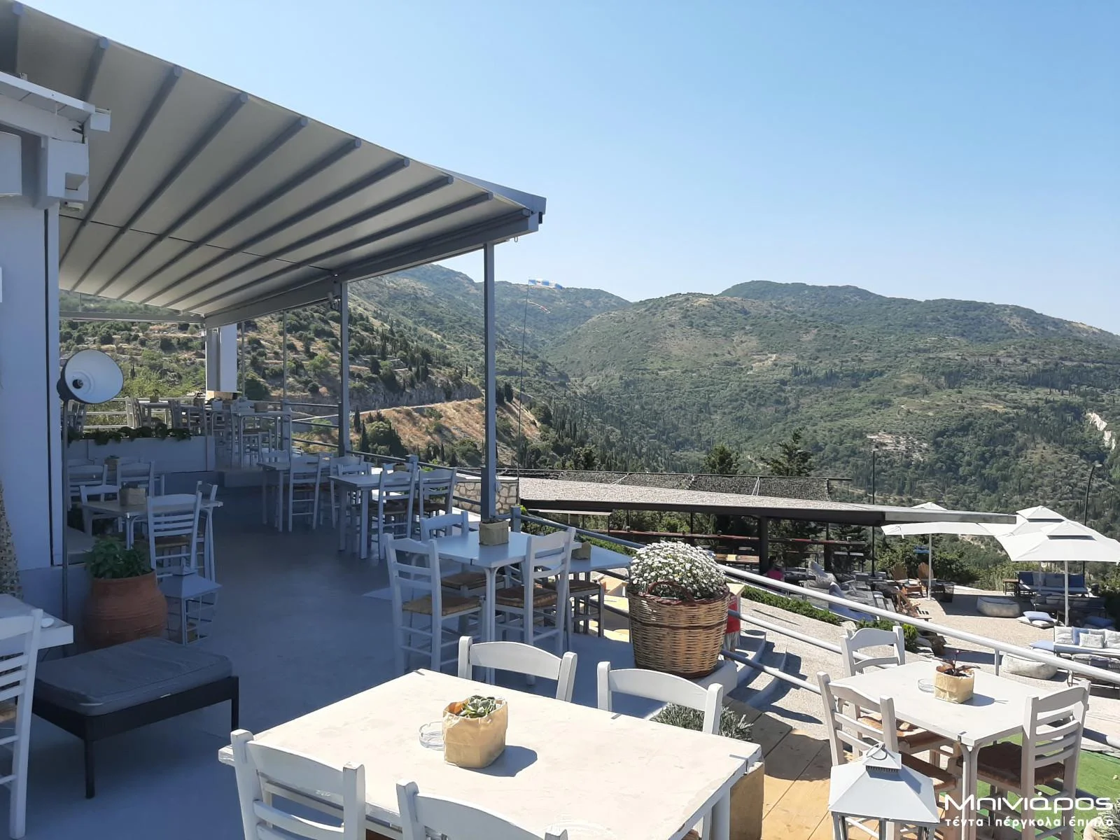 Σε αυτό το ορεινό εστιατόριο στη Λευκάδα, η μοναδική θέα στο ηλιοβασίλεμα αποτελεί βασικό στοιχείο της εμπειρίας των επισκεπτών. Για να αξιοποιηθεί πλήρως ο εξωτερικός χώρος, εγκαταστάθηκε σύγχρονη περγκόλα, η οποία προσφέρει άνεση και προστασία χωρίς να περιορίζει τη θέα προς το φυσικό τοπίο.