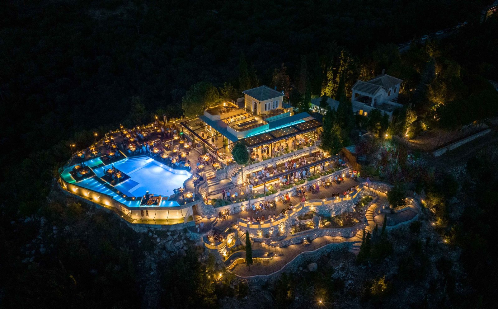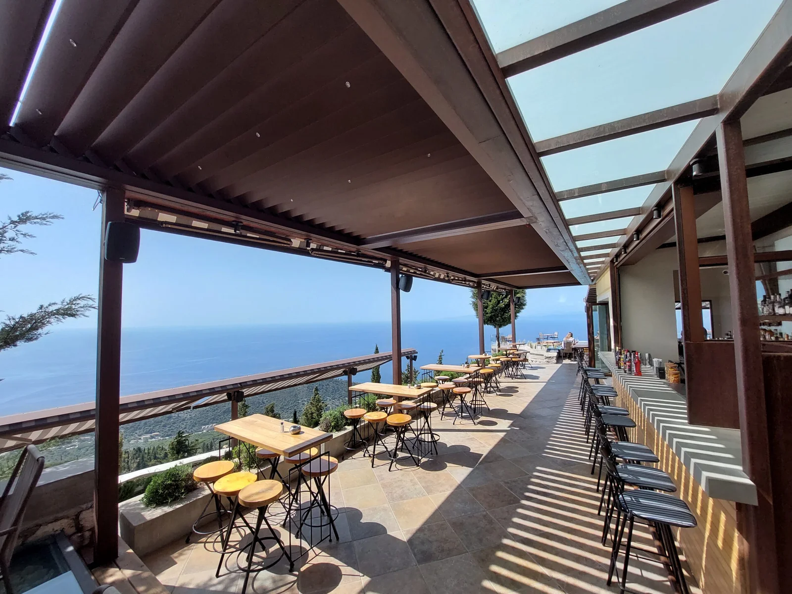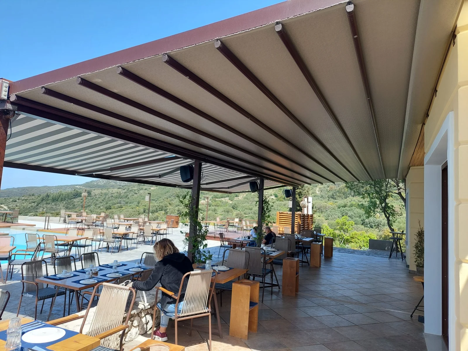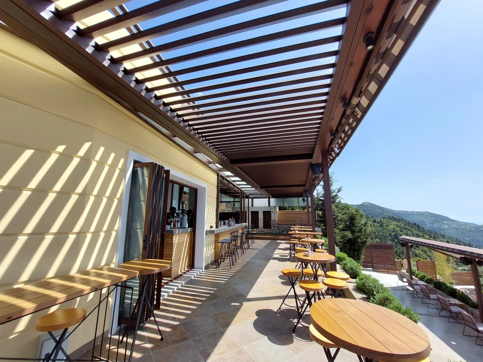 Ο εξωτερικός χώρος σχεδιάστηκε ώστε οι επισκέπτες να απολαμβάνουν το φαγητό ή τον καφέ τους με ανεμπόδιστη θέα, σε συνθήκες άνεσης καθ’ όλη τη διάρκεια της ημέρας. Η πέργκολα προσφέρει φυσική σκίαση και σωστό αερισμό, ενώ τα συστήματα σκίασης επιτρέπουν άμεση προσαρμογή ανάλογα με τον ήλιο και τον αέρα, χωρίς να περιορίζεται η εμπειρία της θέας.